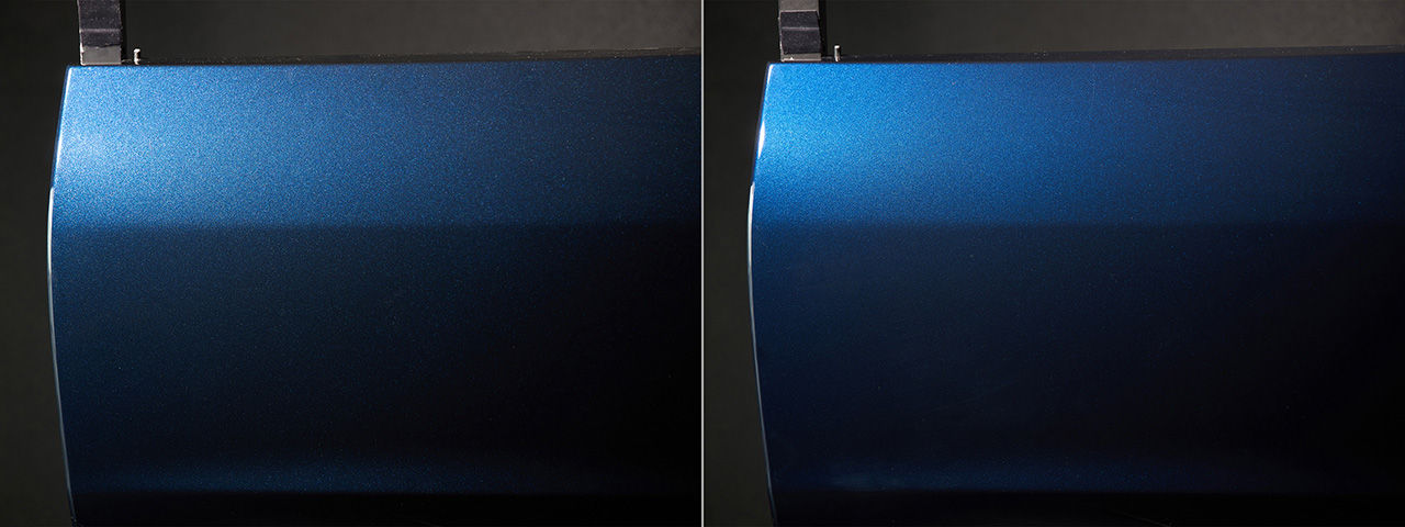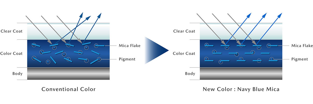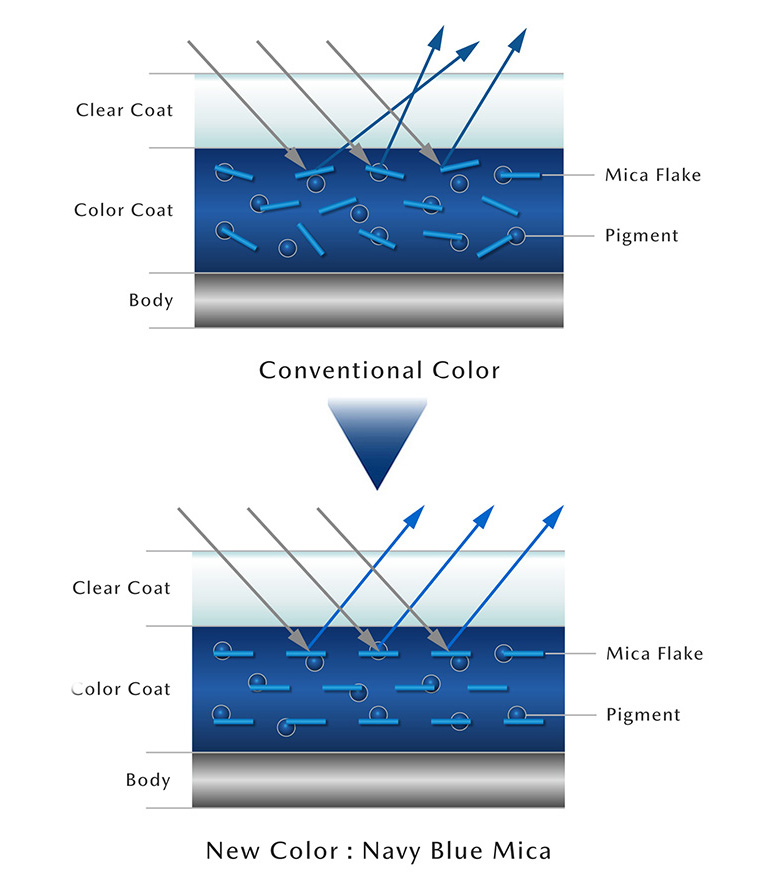 Compared to the previous color (left), Navy Blue Mica (right) has no unnecessary shimmer. The result is a composed, refined brilliance with a sense of depth and quality.