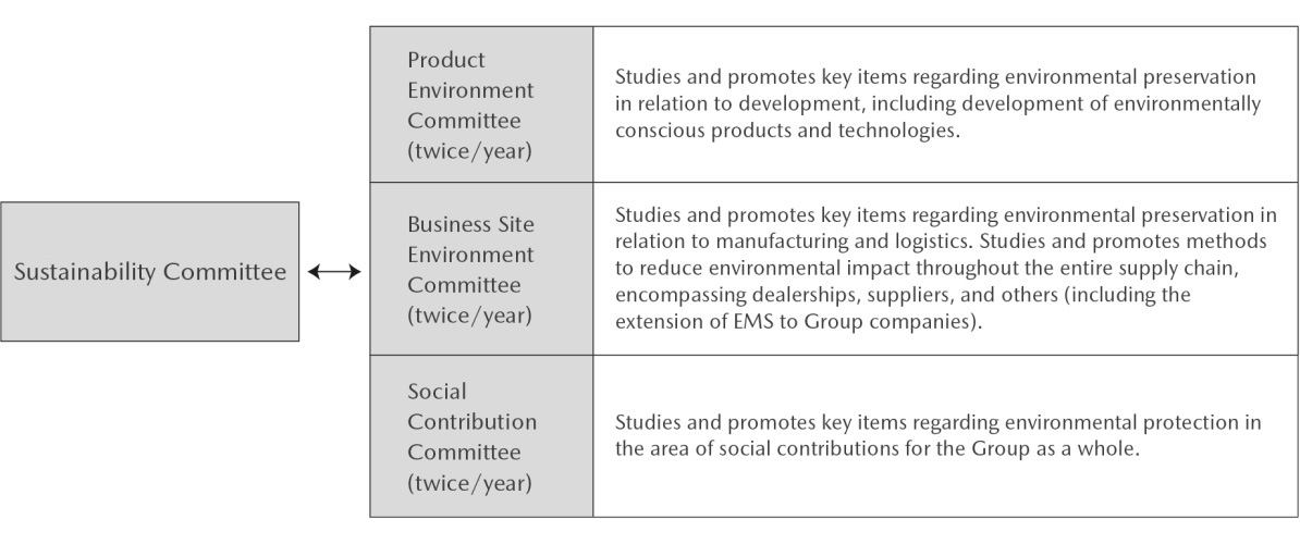 Mazda has established the Sustainability Committee, which is chaired by the executive in charge of sustainability, as well as the Product Environment Committee, the Business Site Environment Committee, and the Social Contribution Committee, which coordinate with the Sustainability Committee. These committees are responsible for environmental management at the Company and at Group companies. Moreover, Mazda reviews this promotion framework in order to further enhance its initiatives.