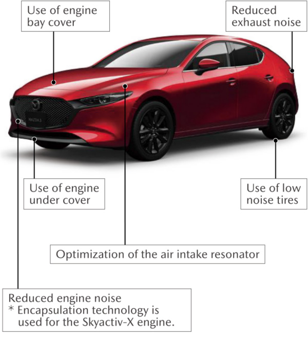 Mazda has established its own noise standards for all vehicle models that are even stricter than the most recent legal requirements. Compliance with said standards is pursued to reduce road traffic noise from Mazda vehicles. The Company has also been actively developing technologies to reduce the three major types of vehicle noises: engine noise, air intake and exhaust system noise, and tire noise.