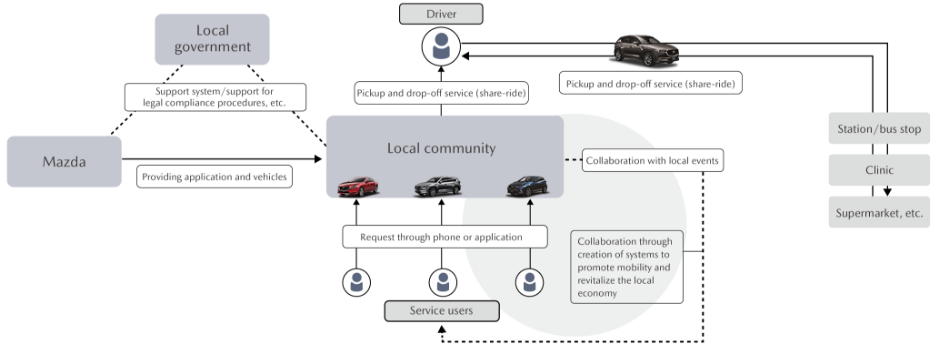 The dilapidation of public transportation systems and lack of other mobility options in hilly and mountainous regions of Japan is becoming a serious social issue. To address this issue, in December 2018 the Company started testing a shared mobility service utilizing its connectivity technologies, in cooperation with local residents and prefectural and city authorities in Miyoshi City, Hiroshima Prefecture. In this project, the Company is in the process of coming up with ideas to improve the convenience of the service through communication with the local community while having residents of the testing sites—the Kawanishi district and Sakugi-cho area of Miyoshi City—continue using the transportation service management system and user application software it developed in order to verify its benefits. Mazda is implementing various measures to ensure seamlessly connected mobility of people and goods inside and outside the community by linking its shared mobility service with local events and with everyday services such as shipping and collection of agricultural products, delivery of food products, and support for everyday issues. The Company thereby strives to create a sustainable service that will be used by as many people as possible and will help invigorate the community.