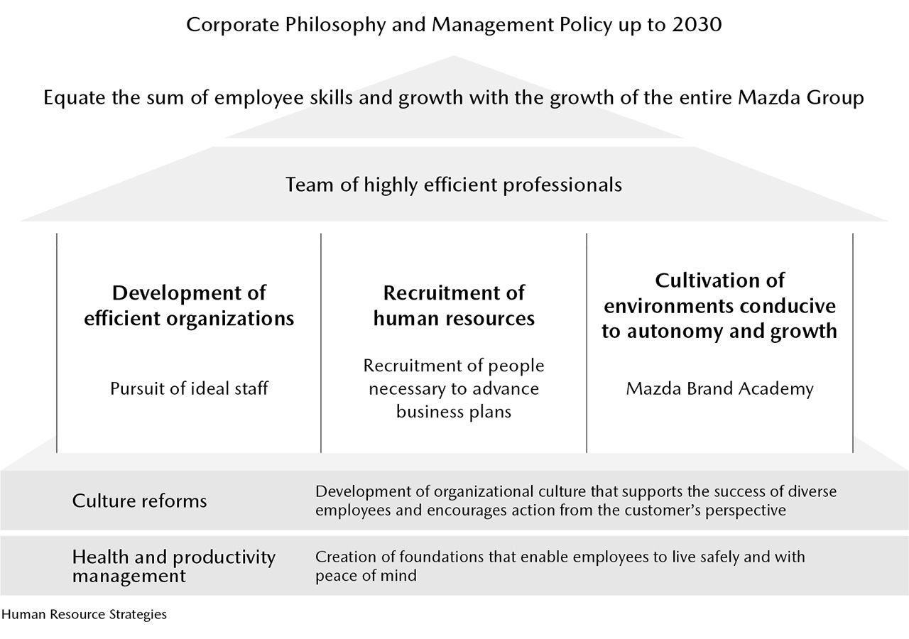 We are seeing a rise in new work tasks needing to be addressed by people in response to trends such as the push for carbon neutrality and the move toward electrification. At the same time, we still need to perform the traditional tasks that existed before. In the past, Mazda has responded to rises in work needs by increasing the number of employees to handle each new task. Today, however, the number of people seeking to join the automotive industry is declining as the workforce contracts and we face uncertainty at a once-in-a-century time of transformation. For this reason, it will likely become more difficult to secure the additional staff required to accommodate rising work needs going forward. To respond to this situation, we will need to improve operational efficiency. We will go about this by reassessing work needs based on business plans and transitioning to more efficient organizations while promoting digital transformation on a Companywide basis. It can be expected that the ways we work will be fundamentally transformed in conjunction with the evolution of generative AI and other digital technologies, which will also change the roles and skills needed of people. We are thus faced with a pressing need to foster autonomous employees who are able to act in a flexible, self-driven manner, under any circumstances, if we hope to adapt to the upcoming changes. Based on this recognition, we have defined the development of efficient organizations, recruitment of human resources, and cultivation of environments conducive to learning supporting autonomy and growth as material human capital issues. In addition, we formulated a medium-term human resource strategy in February 2025 to guide us in exercising our corporate philosophy and advancing the Management Policy up to 2030.
