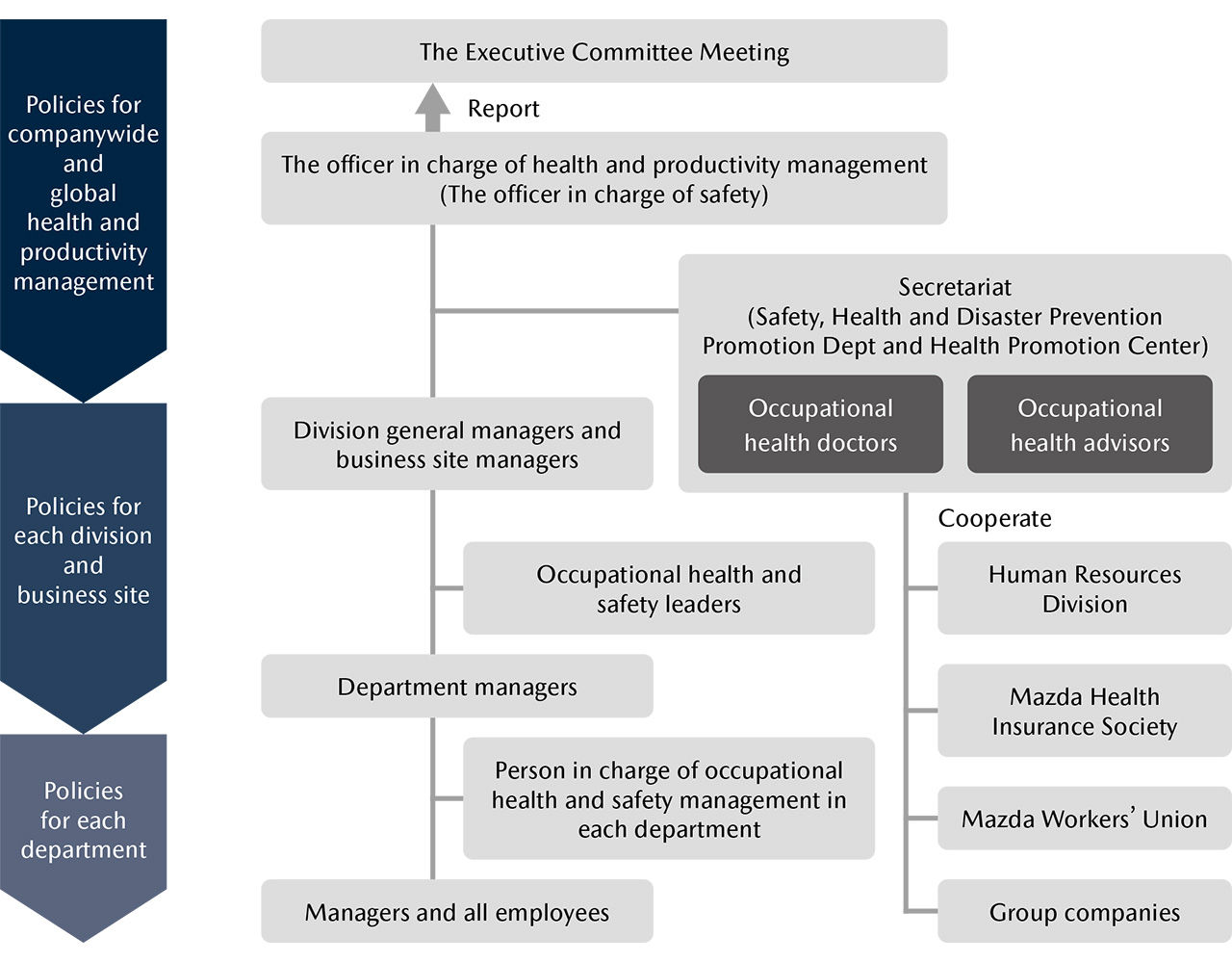 In the past, Mazda has endeavored to create safe workplaces and support employee health improvement under its occupational health and safety management system. We have since built upon this system, and today we have in place a framework for practicing health and productivity management based on the recognition that the physical and mental health of employees is an important factor behind the improvement of corporate value. Moreover, we have assigned responsibility for health and productivity management to the officer in charge of safety and established a secretariat centered on the Safety, Health and Disaster Prevention Promotion Department to facilitate efforts to tackle increasingly complicated health challenges. Through this framework, we promote coordination among the Mazda Health Insurance Society, Mazda Workers' Union, and Group companies as we advance ongoing efforts to identify health challenges and formulate, implement, and verify response measures.