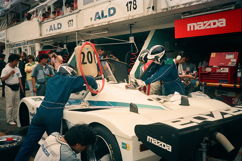 1985年のルマンを走った85号車マツダ737Cは、マツダ初のグループCジュニアマシン「マツダ717C」の熟成完成版としてルマンに投入されました。周囲の期待も大きく、日程的にもマンパワー的にも無理を承知しながら3台のマシンを組み上げ、その都度サーキットでテストして仕上げていました。この85号車もルマン直前の同年6月第1週まではルーフ周りがレッドとシルバーに塗り分けられていましたが、イギリスで行ったサーキットテストで燃料が漏れるトラブルが発生して炎上。3日間で全焼したマシンを修復して間に合わせましたが、塗装だけは間に合いませんでした。