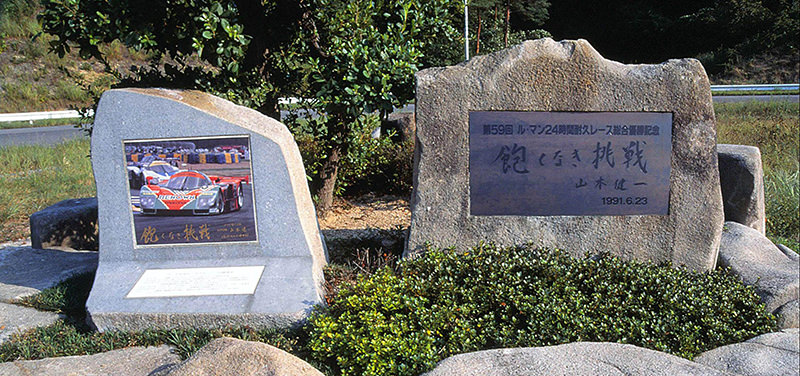 1991年にルマン24時間レース総合優勝を果たしたのち、ロータリーエンジン生みの親である当時の山本健一会長は、この成果をマツダの資産のひとつとして後世に語り継がれる「かたち」を残したいと考えました。その結果、マツダの開発拠点のひとつである広島県の三次自動車試験場内テストコースに記念の碑を建立することとなりました。1992年2月に除幕されたその石碑には、山本会長の揮毫による「飽くなき挑戦」の文字が刻み込まれています。合わせて記されている「1991年6月23日」の日付は、マツダ787Bがトップでルマンのフィニッシュラインをクロスした日を示しています。