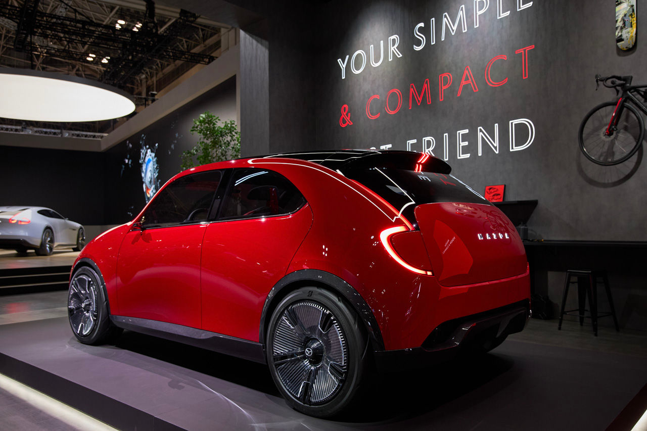 ポップなデザインに振り切ったMAZDA VISION X-COMPACT。エクステリアからは親近感や愛らしさとともに、今回のVISIONモデルのキーワードのひとつである「塊感」も伝わってくる。