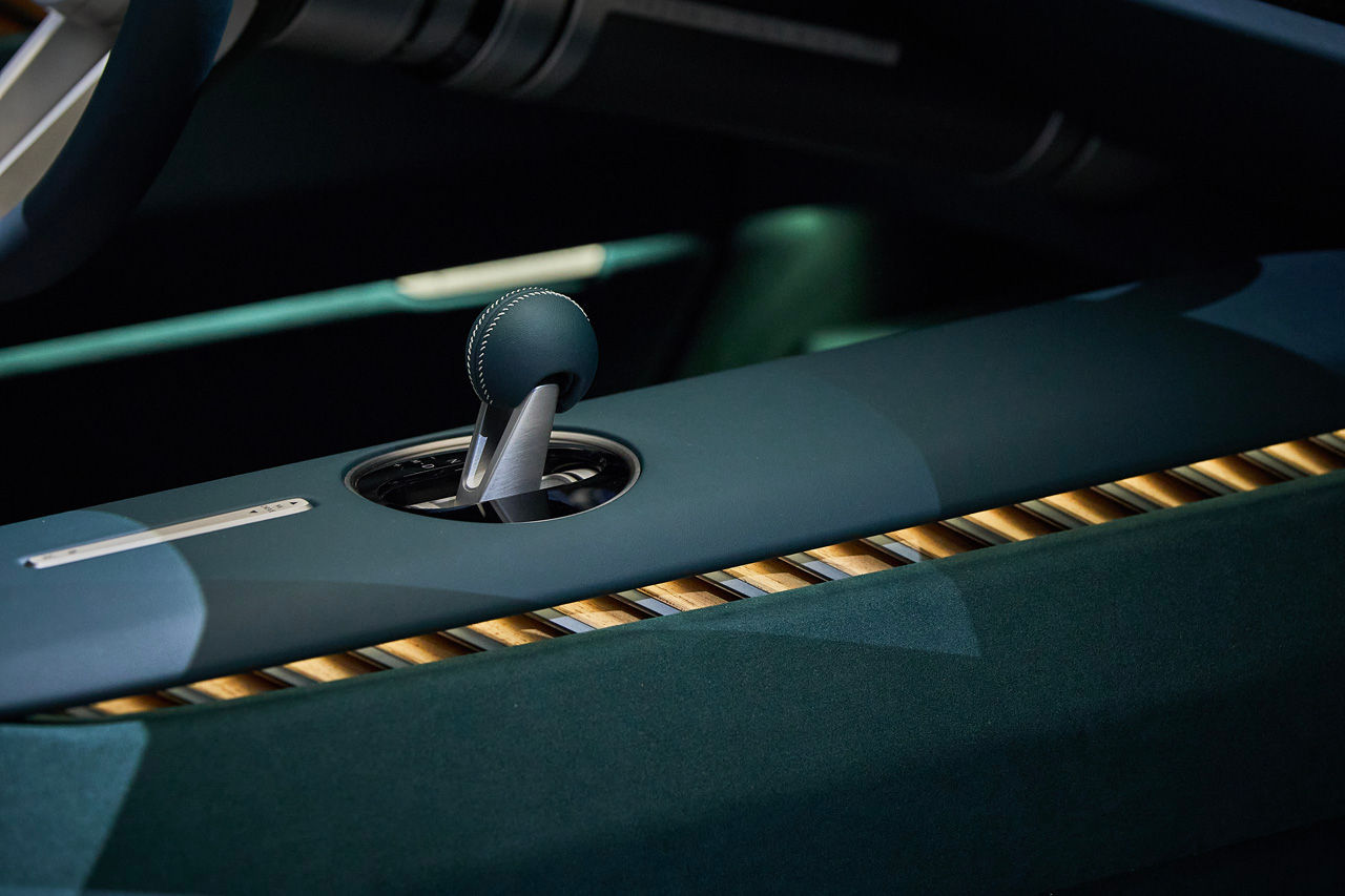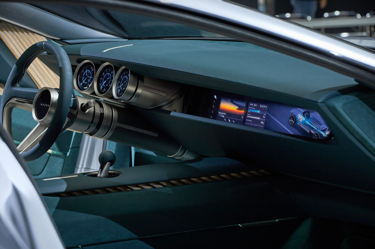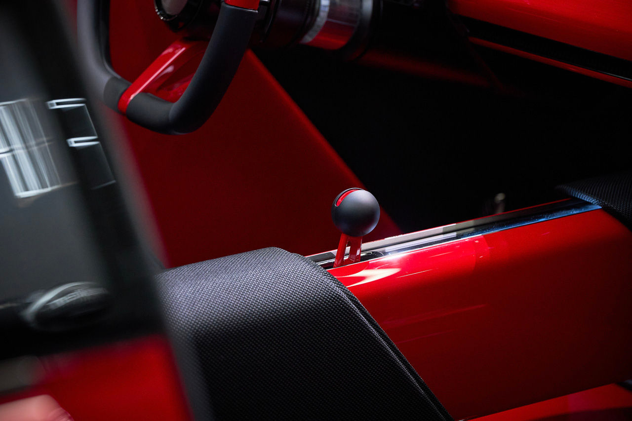 水平基調のインストルメンタルパネルに丸型メーターが並ぶ。円形のステアリングやシフトノブとともに、内装からはオーセンティックな雰囲気が漂う。インフォテイメントのためのスクリーンは運転視界を遮らない位置に配置し、ドライバーが運転に必要な情報をメーター付近に集中させ、ドライバーオリエンテッドな空間を表現。