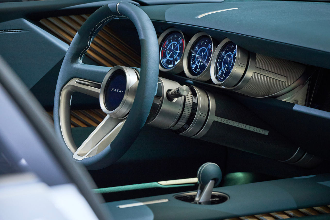 MAZDA VISION X-COUPEでは、ドアを開けた瞬間にドライバビリティを感じさせる3連メーター、ステアリング、シフトが際立つコクピット空間がポイント。運転により没入できるような新しいマツダのインテリアを目指しました。苦労したのは『継承と進化=ネオ・オーセンティック』をインテリアでどう表現するかでした。継承の面では、シンプルで運転に集中できる基本骨格にこだわり、進化については、サスティナブル素材、表面処理などが専門のCMFデザイナー(CMF:カラー/マテリアル/フィニッシュ(表面処理))に加えてインターフェースデザイナーとも共創し、人の感覚に沿った空間演出を目指して検証を重ねました。結果として新しい時代の価値観やニーズ、デジタライズされた要素をインテリア空間に取り入れることができ、『継承と進化』という課題をチームで乗り越えられたと思います。