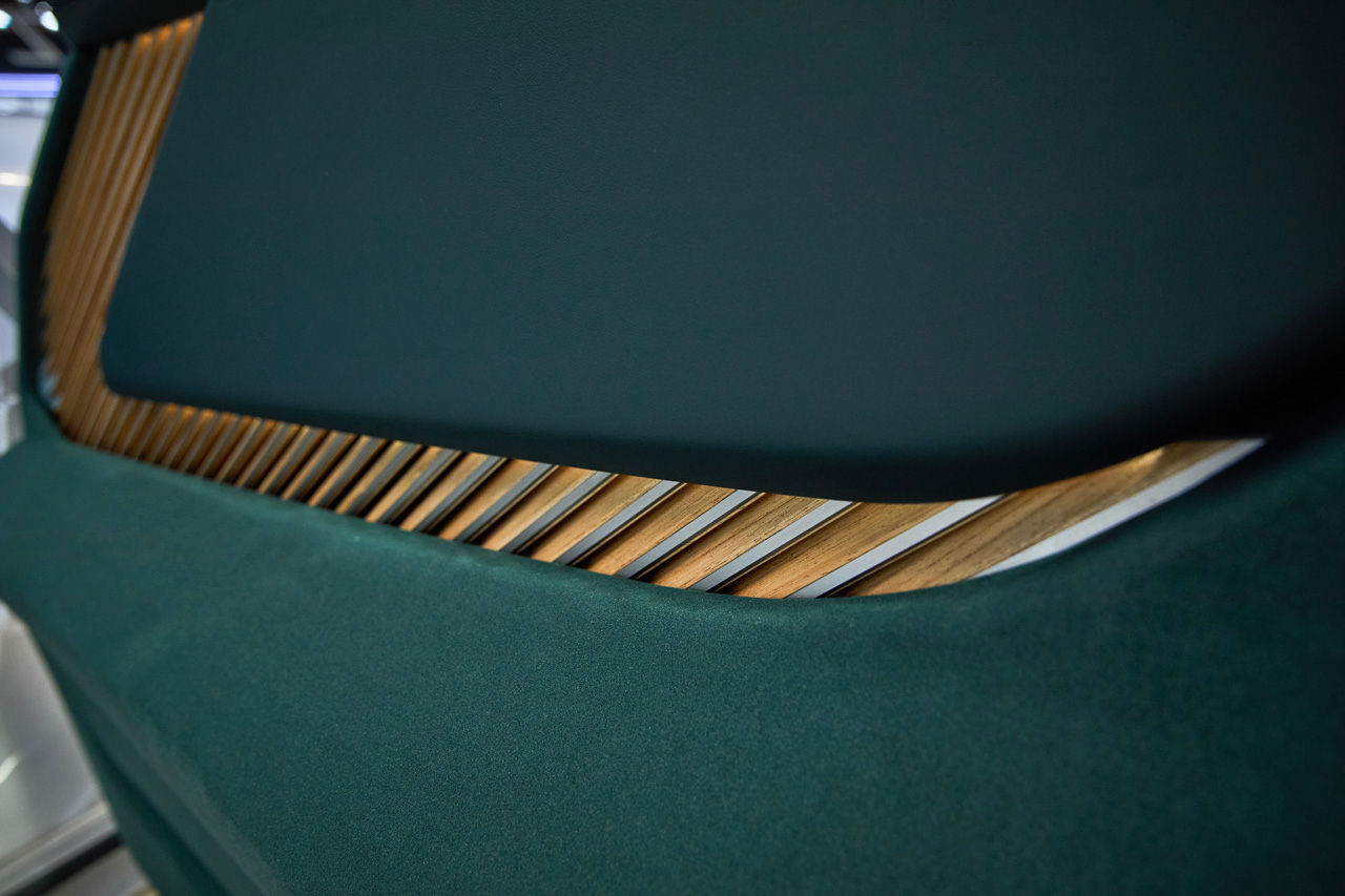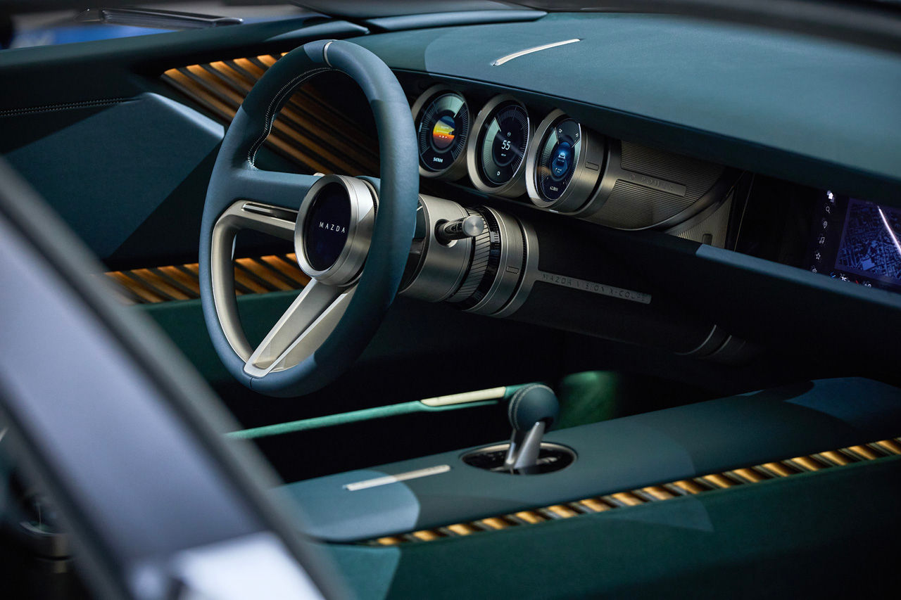 ドアを開けた瞬間に目に飛び込む3連メーターに運転意欲が一気に高まる。瀬戸内の海の色からインスピレーションを受けた「シーグリーン」の内装色も特徴的で、間接照明の演出と合わせて上質さと心地よさを併せ持った室内空間を感じさせる。シートには牡蠣殻を再利用した繊維素材が使われており、“牡蠣殻処分”という地元広島の地域課題解決の新しいアプローチも提案。