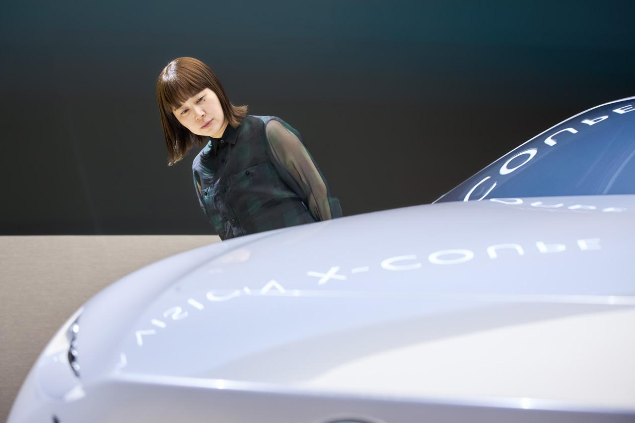 私は内外装のカラー、マテリアル、フィニッシュ(表面処理)の領域で2つのVISIONモデルに携わりました。MAZDA VISION X-COUPEでは新しいボディカラー『グラスシルバー(GLASS SILVER)』を開発しました。「ネオ・オーセンティック」というテーマから、CMFでは“未来に残すべき本質的価値”を探ることにしました。魂動デザインが自然環境と向き合った姿としてどうあるべきかを考えているうちに、生命感の源は水なのでは?と思うように。そこで今回はあえて色味を排して質感だけでチャレンジしてみようとスタートしました。透明感があるのに金属の強さも感じさせる、モダンで色気のあるシルバーを目指しました。景色の色と共鳴する美しさ、明るい未来のマシン…そんなイメージが伝わったらいいなと。明るいグレーの下地の上に超微粒子メタルを何十層と重ねて金属が透けているような質感を表現したのですが、せっかく作り上げたメタルの色味が試し塗りのときと本番では違ってしまい、その原因を突き止め、本社の塗装ブースと同じ色をモデルメーカーの塗装ブースで再現することにとにかく苦労しましたね。内装ではシーウールという牡蠣殻を再利用した繊維素材もシートに使用したり、瀬戸内海の美しい海の色からインスピレーションを受けた「シーグリーン」の内装色もポイント。ボディで色味を抜いたので内装では少し色で遊び心を。落ち着いた上質さと軽やかな心地よさを両方味わえる大人の空間になっていると思います。