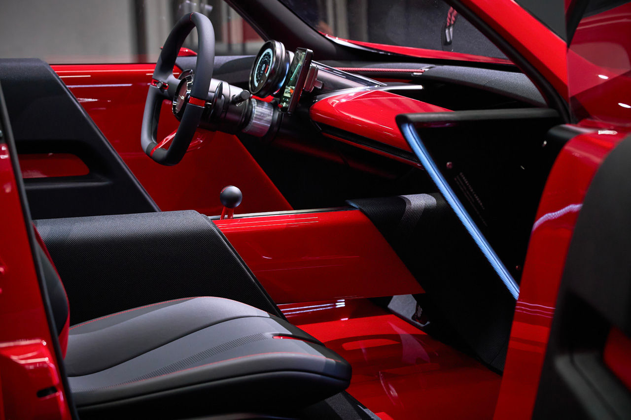 エクステリアの鮮やかなビオラレッドのボディ色が室内を横断する特徴的なインテリア。スポーティな合皮、丈夫なギアのようなナイロンファブリック、和紙のようなリサイクルカーボン、メカニカルな金属、先進的な透明素材、ワイヤーなどバラバラな要素をバランスよく統一感をもってまとめられている。スポーティにみえてどれもサスティナブルな素材で構成されているのも、これからの時代の相棒には大切な要素。