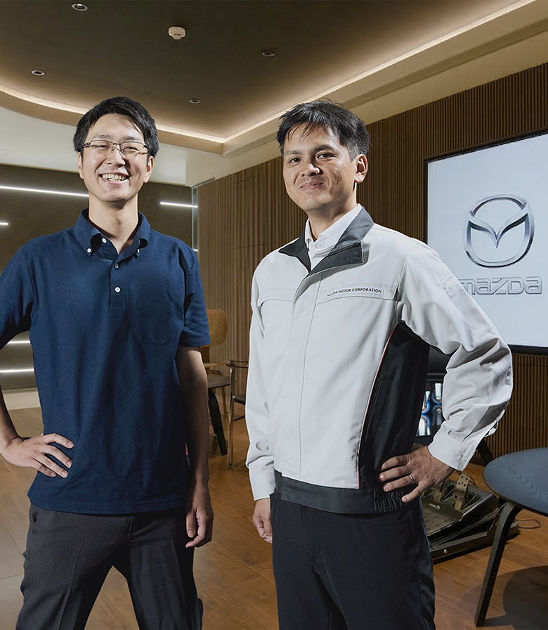 はい。私は、他の自動車メーカーを経て2019年にマツダに入社しました。これまで、エンジンの燃費や排ガス量をシミュレーションするモデルを活用しながら、パワートレインの設計・開発に携わってきました。現在は、クルマの制御に関するさまざまな要素を仮想化・デジタル化する取り組みや、ドライビングシミュレーターの技術開発を担当していて、エキスパートドライバーと共に、シミュレーターの“育成”をしています。
