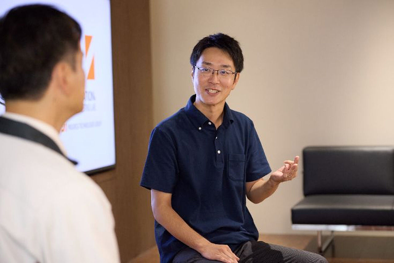 技術研究所 次世代人間中心システム研究部門の佐藤大地。人間を計測した結果をモノに反映させ、人々の暮らしを豊かにしたいという想いでマツダに入社。4歳の娘を溺愛する子煩悩なパパという一面も。