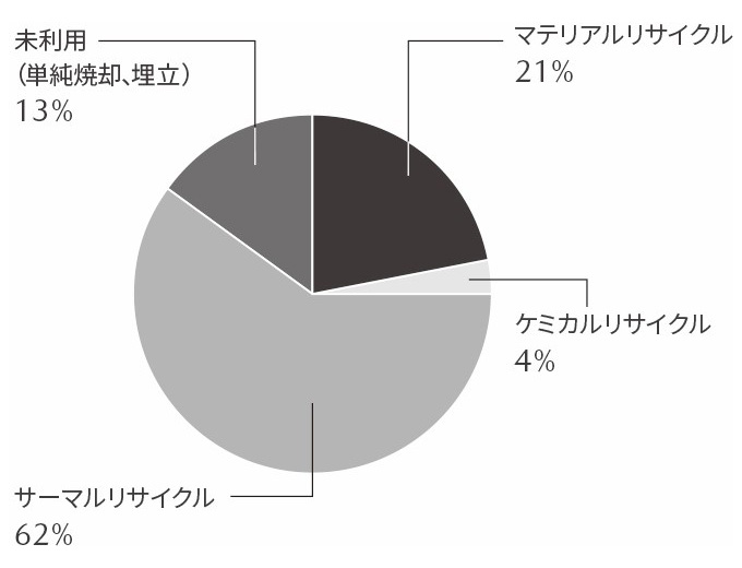 サーキュラー・エコノミーの実現にあたり、プラスチックのリサイクルは欠かせません。現在、日本では、廃プラスチックのリサイクルのうち約60%は燃焼してエネルギーに変換するサーマルリサイクルを行っています。一方、欧米では、燃焼をリサイクルの概念に含めないことや燃焼する過程でダイオキシンが微量に発生することから、循環利用(マテリアルリサイクル・ケミカルリサイクル)またはバイオマスプラスチックの使用が求められています。