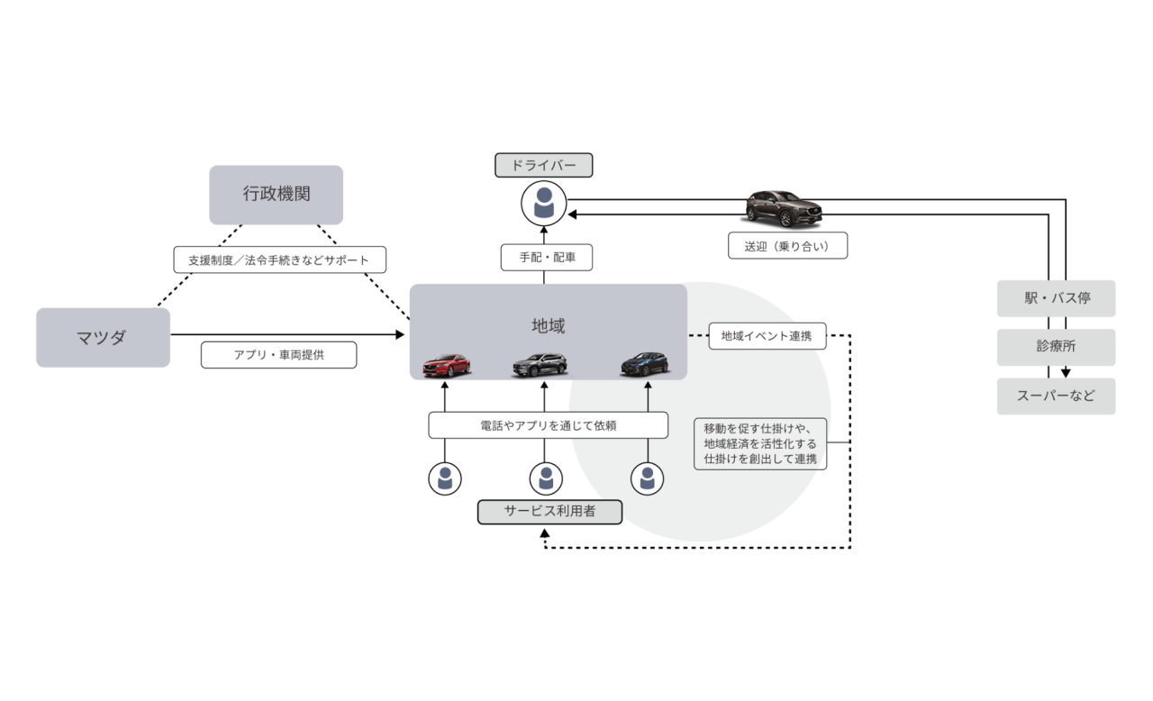 日本の中山間地域では、公共交通の空白化などによる移動手段の不足が社会問題になっています。2018年12月に、マツダは広島県や三次市、地域住民のみなさまと連携して、コネクティビティ技術を活用した支えあい交通サービス実証実験を開始しました。実証地域の三次市川西地区と作木町の方々に、マツダが開発した運行管理システムおよび利用者用アプリを継続利用していただきながら地域との対話を通じて利便性向上と効果検証を行っています。現在、地域交流イベントや、農産物の出荷・集荷、食料品の配達、生活の困りごとへの対応などの生活サービスと支えあい交通サービスの連携により、地域内外の人や物の移動をシームレスにつなぐといったさまざまな施策を通じて、より多くの人々に使っていただき、地域活性化につながる持続可能なサービスの実現に向けて取り組みを進めています。