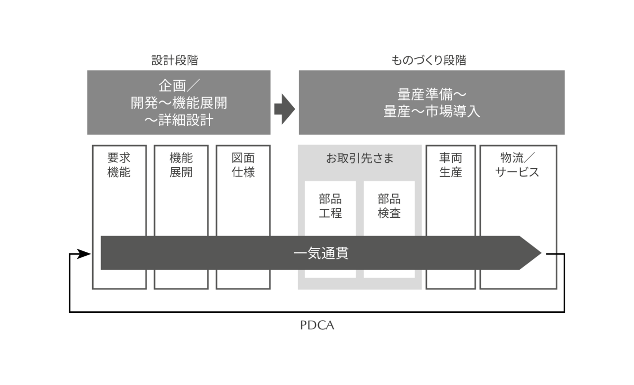 商品性能のさらなる向上や環境安全規制・電動化に対応する新技術の品質レベルの向上のため、設計段階(企画・開発)からものづくり段階(購買・車両生産・物流・サービス)まで一貫した「プロセス保証」に重点を置いて品質のつくり込みに取り組んでいます。お客さまの要望や期待を正しく理解したうえで、機能や性能を保証するための重要特性を明らかにしながら、設計からものづくりの各段階まで維持・管理できる仕組みを構築しています。なお、品質レベルの向上にはお取引先さまのご協力が不可欠であり、人材交流や技術交流などによる共創活動に取り組んでいます。さらに、走る歓びを体現する機能や性能を、お客さまが運転する前から走行後までのシーンごとに明確化し、一貫した品質のつくり込みを強化しています。